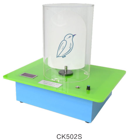 用於(yú)演示視覺暫留現象。物體在視網膜上成像一旦外界光刺激消失,像也随之消失,但視神經對光刺激印象可保留約 0.1 秒時間,也就是人眼的視覺暫留特性。因此隻要先後出現在眼前的兩幅畫面間隔時間小於(yú) 0.1 秒,視神經會把兩幅畫面“疊加”。開啓設備(bèi)電源,調節變速器,當電機到達一定轉速時,鋁面闆絲印的鳥與鳥籠仿佛重疊在一起,給人的感覺好像鳥處於(yú)鳥籠中一樣。